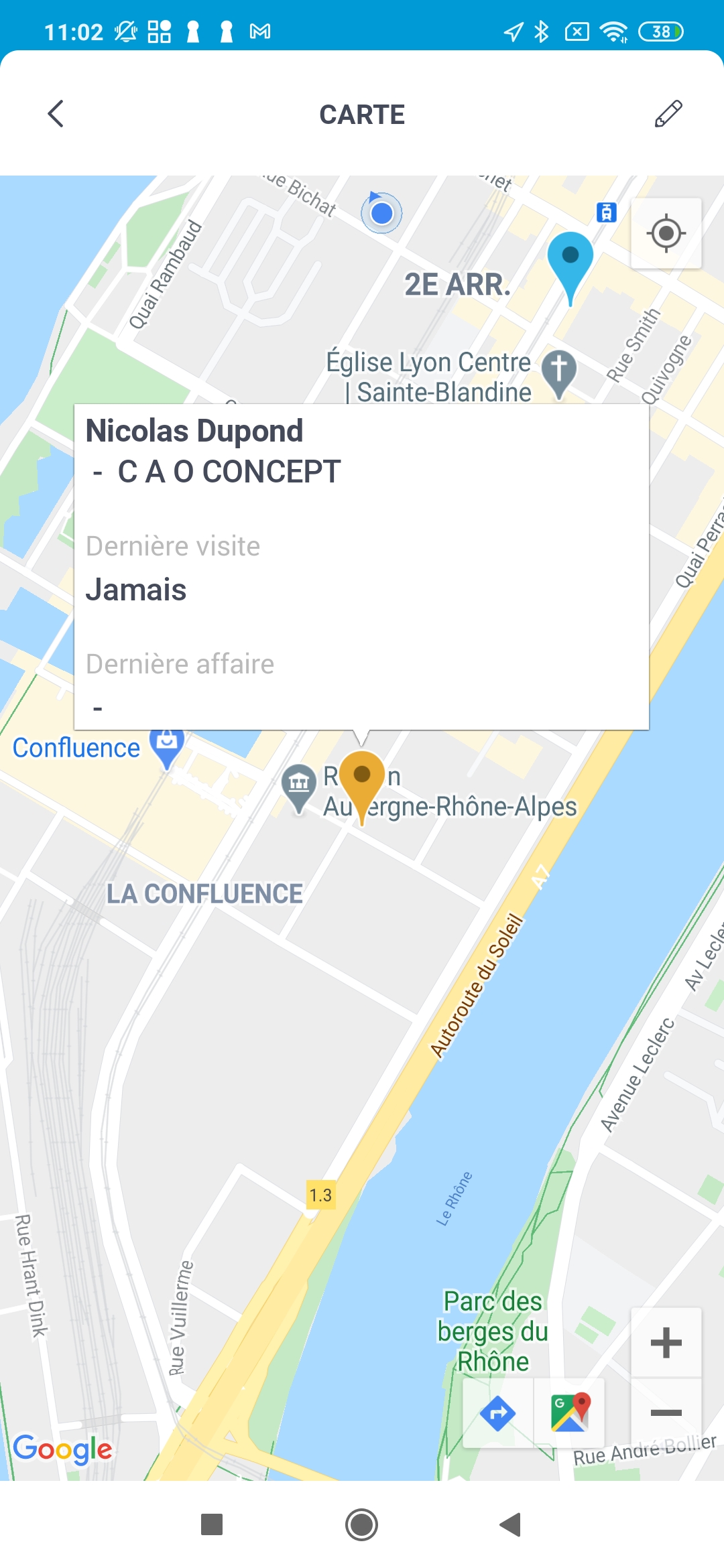 Des raccourcis permettent d'appeler le compte, d'afficher la fiche du compte ou de lancer la navigation avec Waze.
