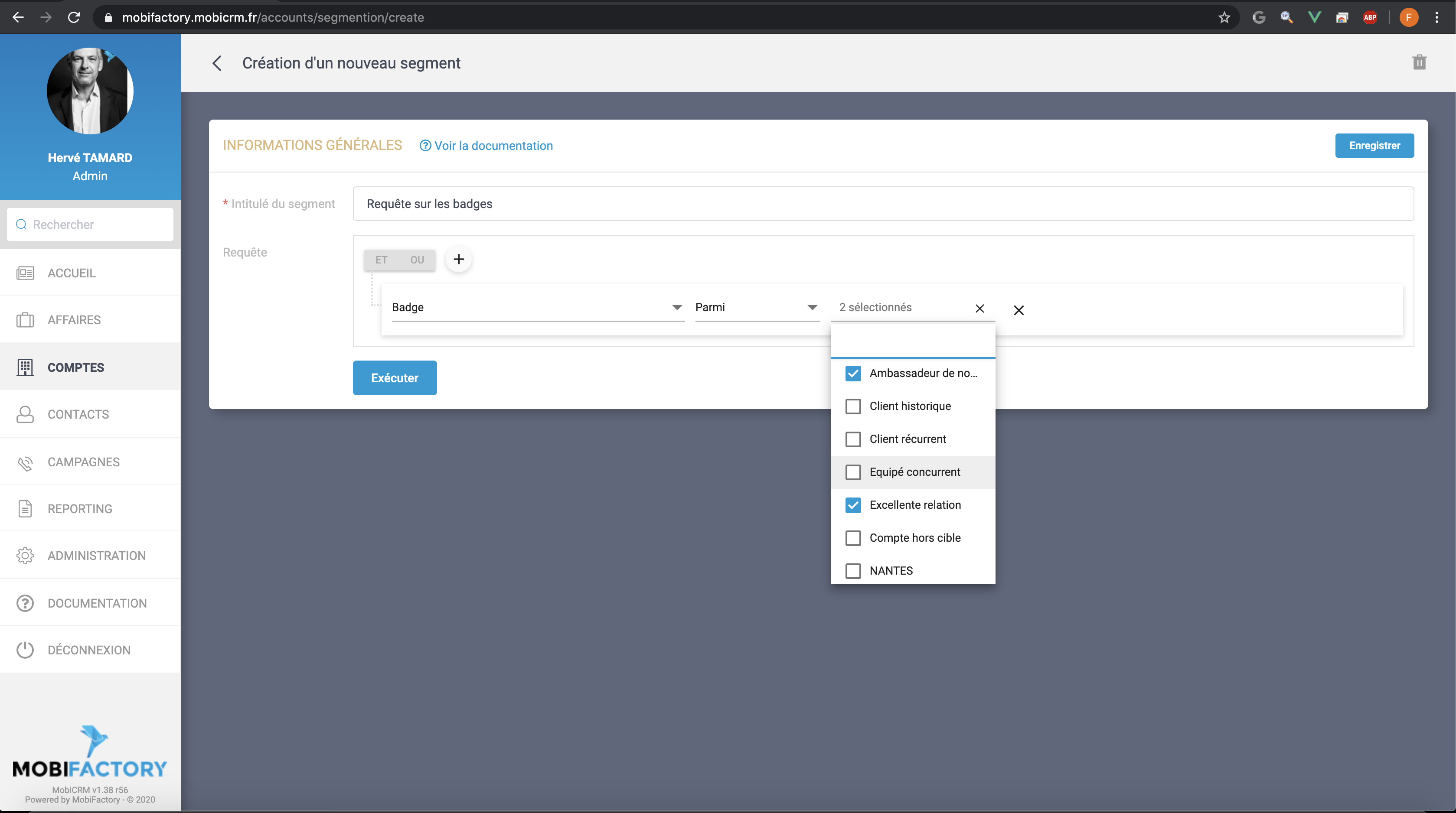 La segmentation est l'outil qui vous permet de faire des requêtes dans la base de données afin de segmenter des comptes, des clients, des prospects et de faire ensuite des actions, comme Envoyer vers Excel. Il est accessible à partir du menu Comptes/Segmentation.