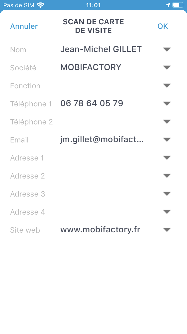 • Scan de carte de visite par import (import d'une image de carte de visite déjà présente sur votre smartphone)