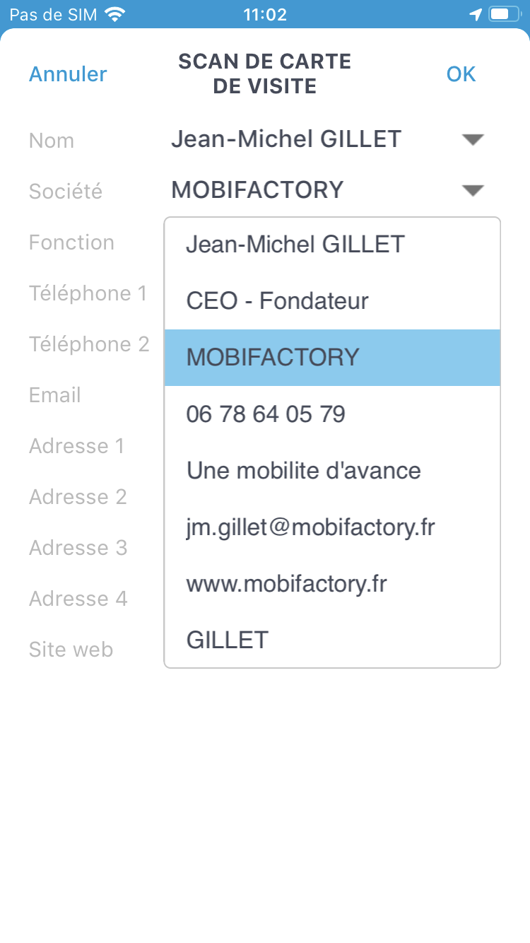 1. Une fois la carte de visite sélectionnée, un traitement d'extraction des informations et d'analyse du texte récupère les différentes informations pour les afficher dans la nouvelle fiche intermédiaire de création de contact.