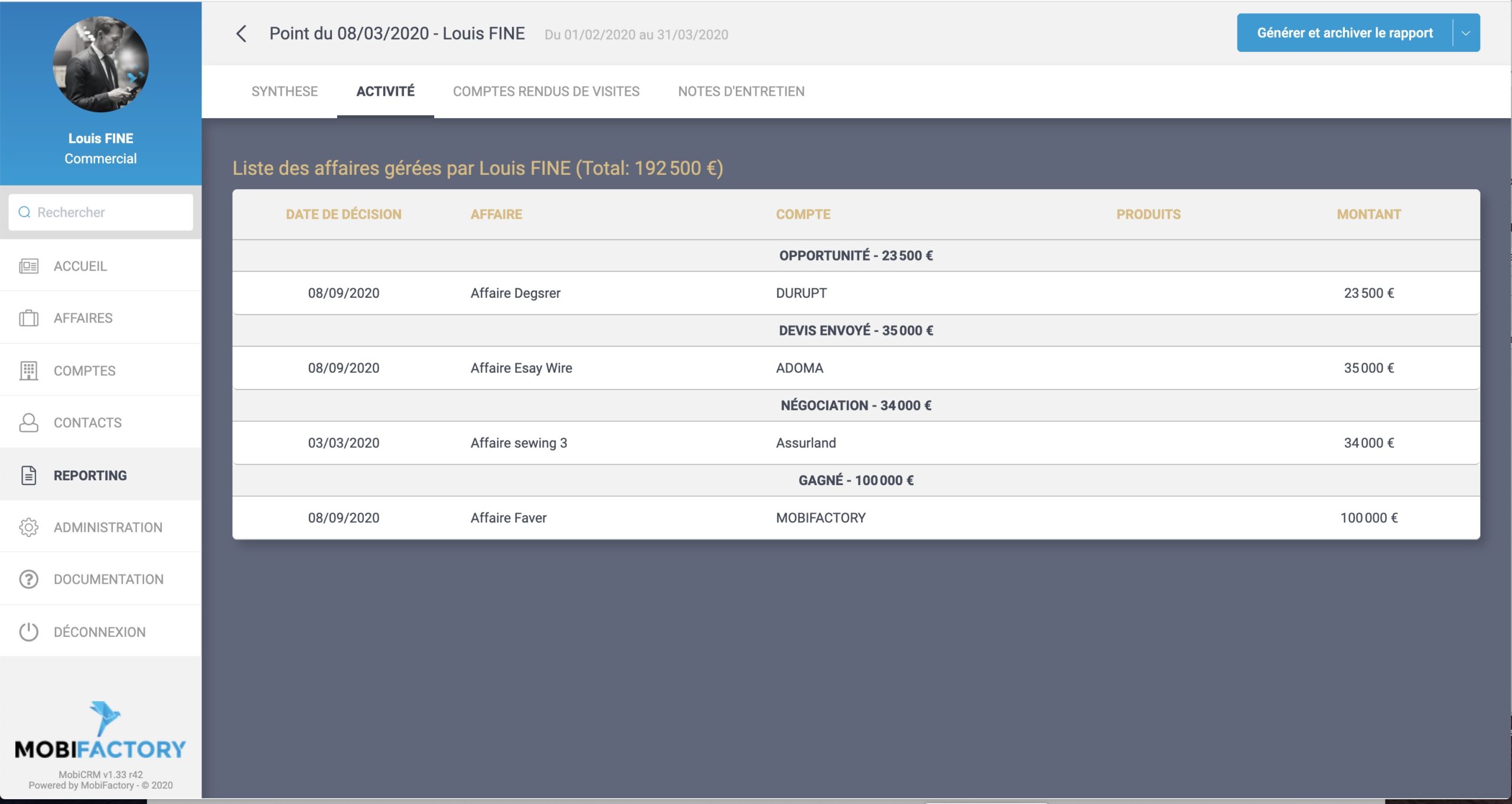 Est affichée alors la synthèse de l'activité, la photo de l'activité à date depuis le début de l'exercice et sur la période sélectionnée.