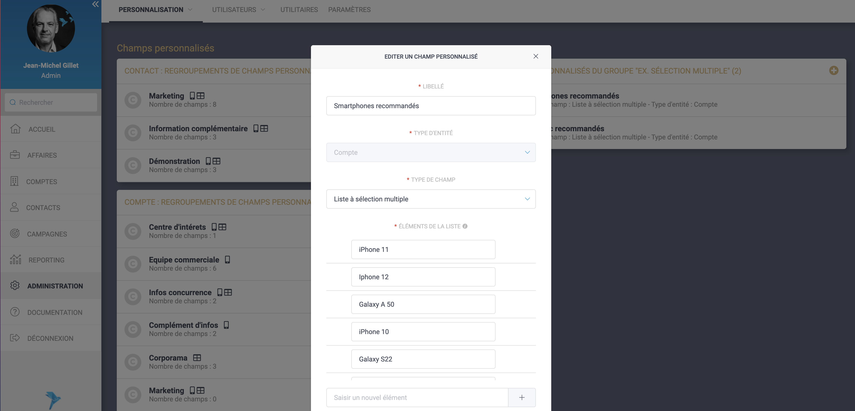 Personnalisation : champs personnalisés : nouveau champ Liste à sélection multiple ( Mobile et Web)
