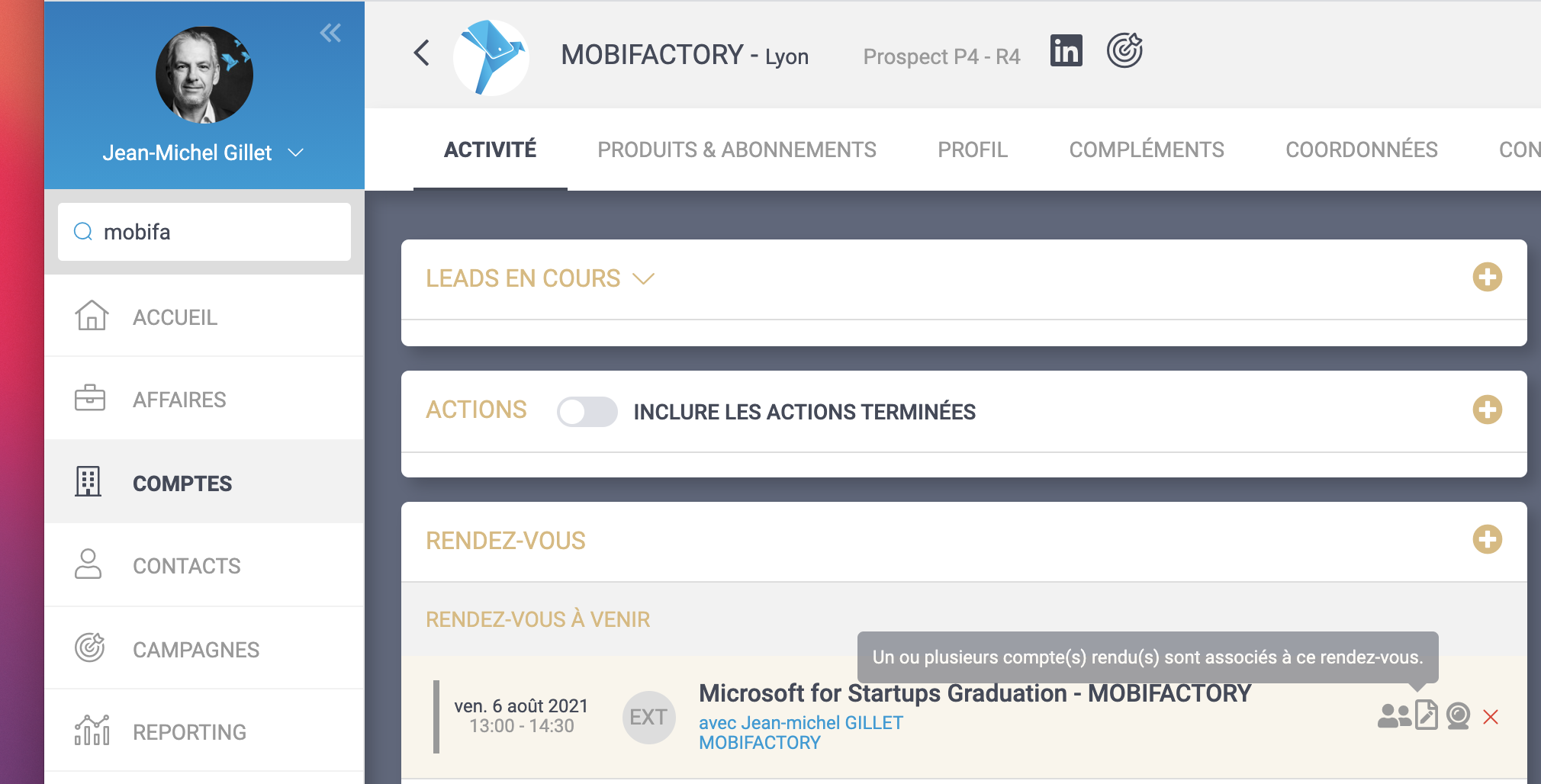 Compte-rendu de visite suite à un rdv ; une icone apparait pour signaler qu’un compte-rendu a été fait à la suite du rdv (dans les vues calendrier, dans le 360 client).
