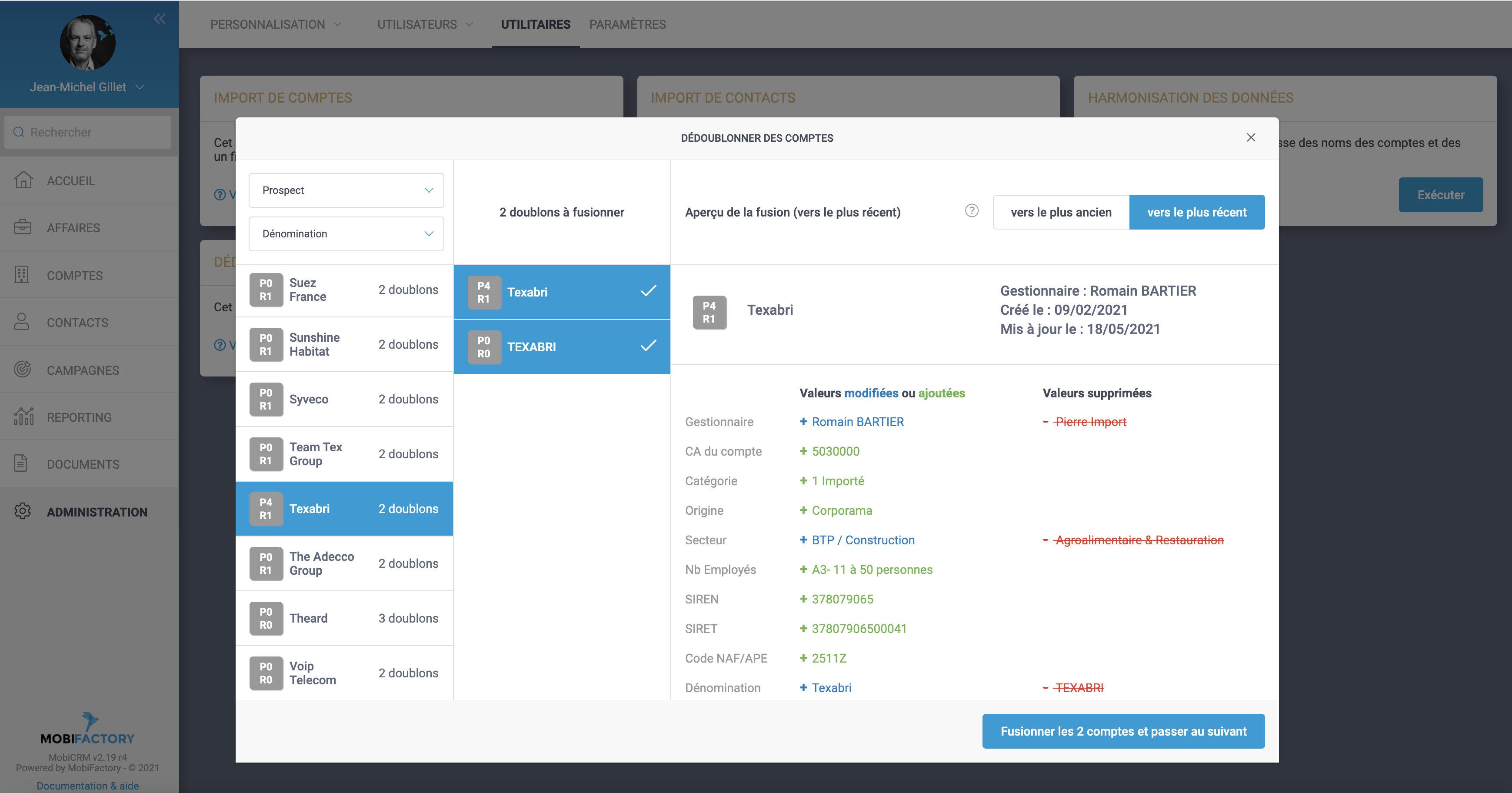 Détection et fusion des doublons sur les comptes