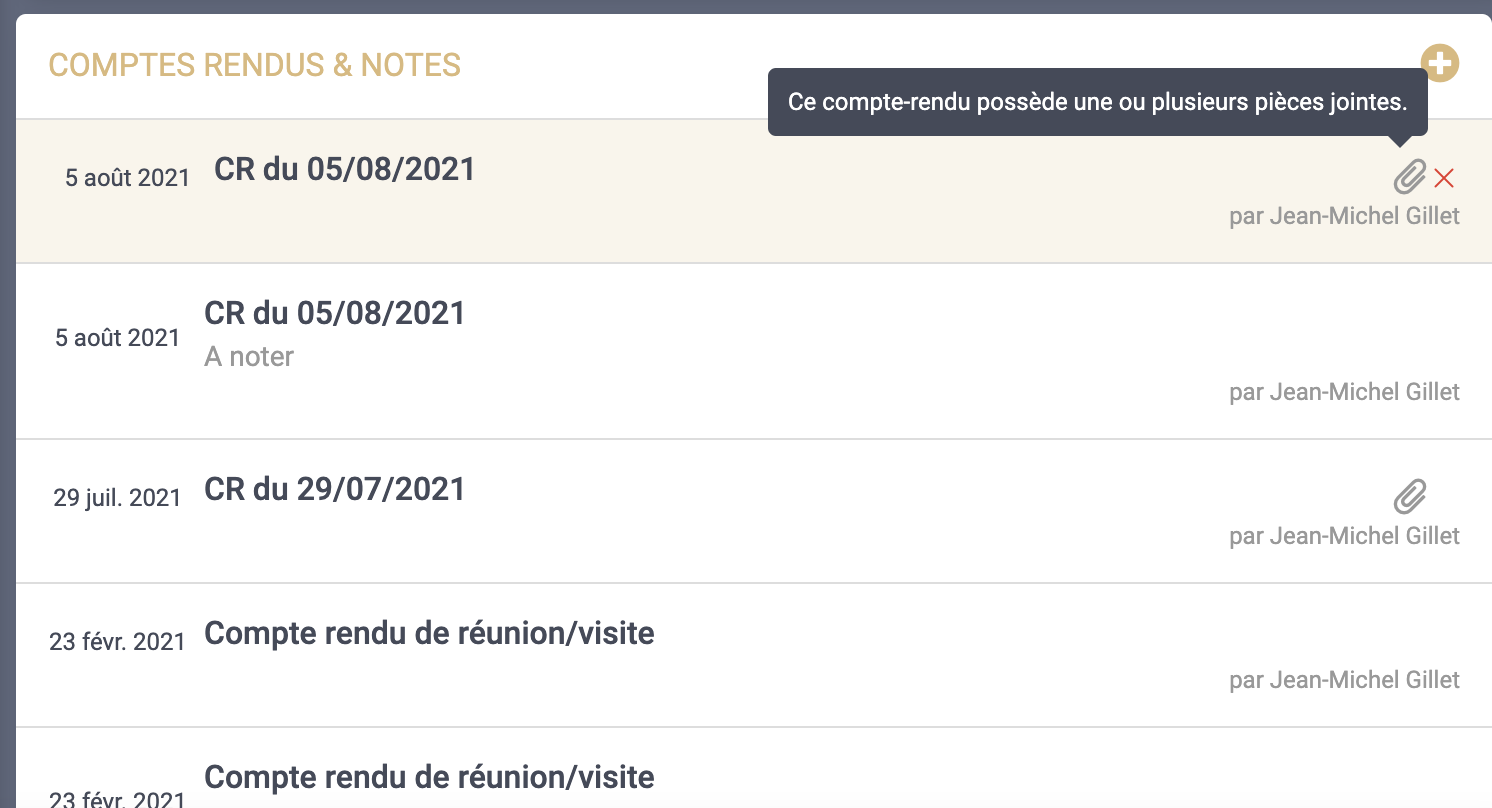 Comptes-rendus : lorsqu’une pièce jointe ou une photo ont été ajoutées à un compte-rendu, une icône apparait.