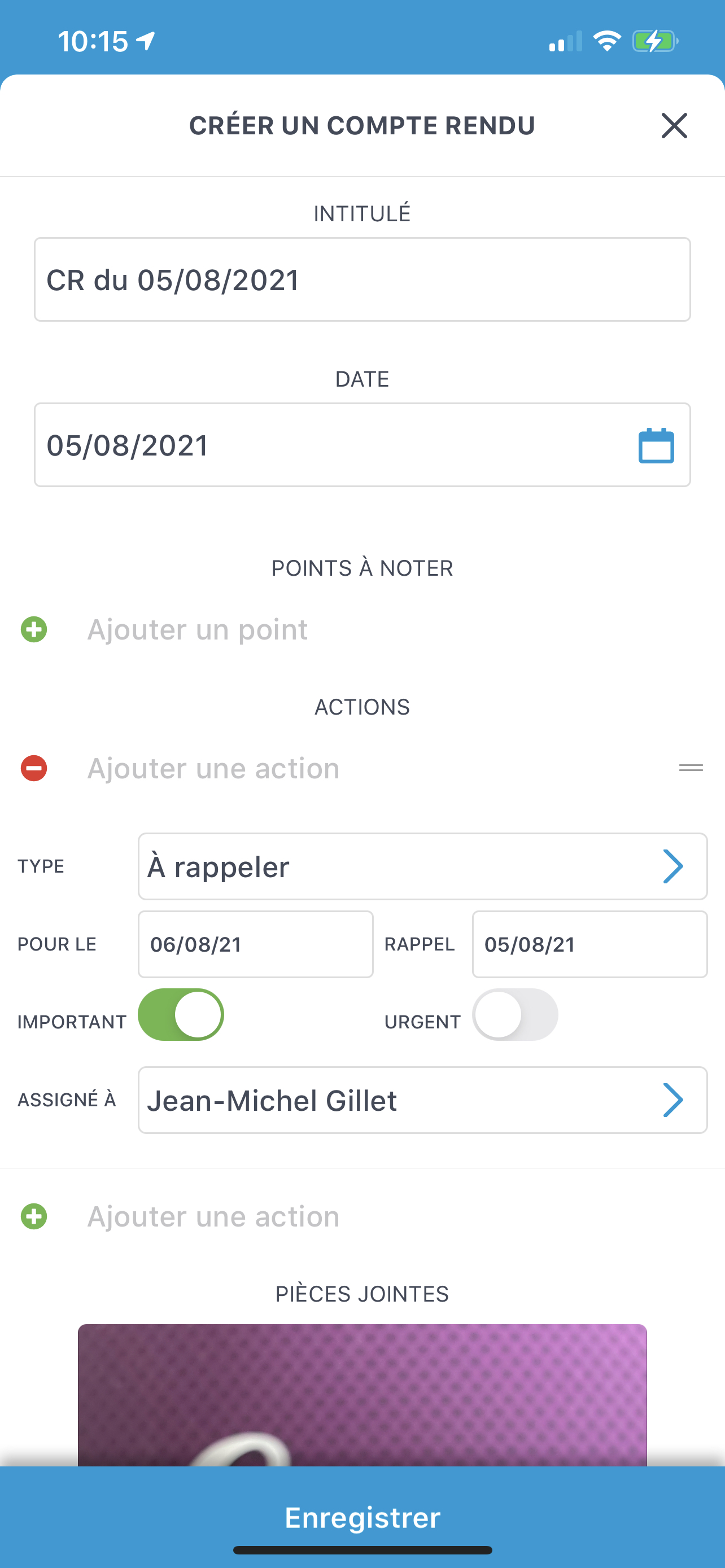 Dorénavant, dans la saisie des comptes-rendus, vous pouvez de suite assigner une action à une autre personne. Vous pouvez également prendre directement une photo et l’ajouter à votre CR, en plus des pièces jointes et des images.