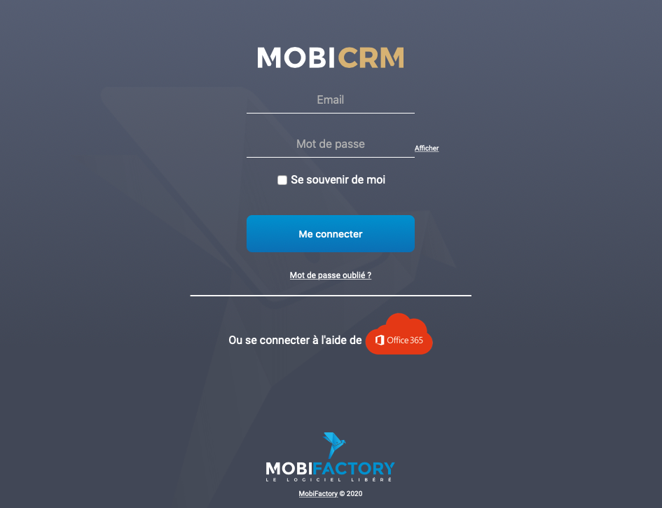Si votre login MobiCRM est le même que votre login Office 365 (ex: vous utilisez le même login jean.dupont@societe.com pour vous connecter à Office 365), vous pouvez alors vous connecter à MobiCRM en utilisant vos identifiants Office 365.