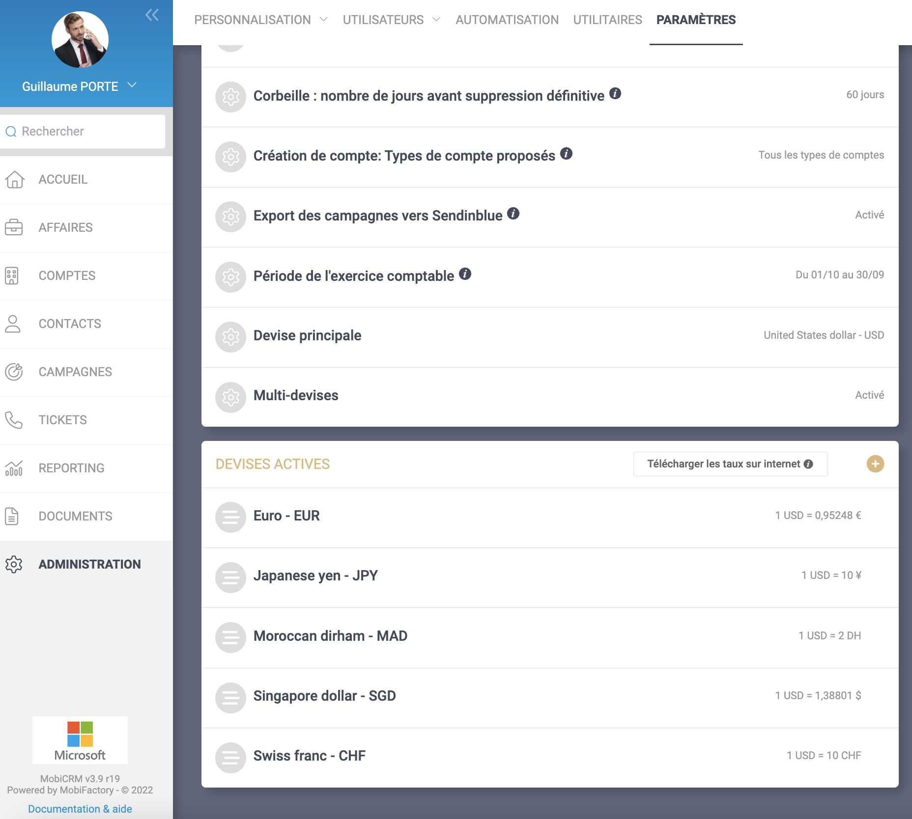 Cette fonctionnalité n’est pas activée par défaut, son activation se fait dans le menu administration. Attention, une fois que MobiCRM est configuré en multi-devises, le retour arrière n’est plus possible